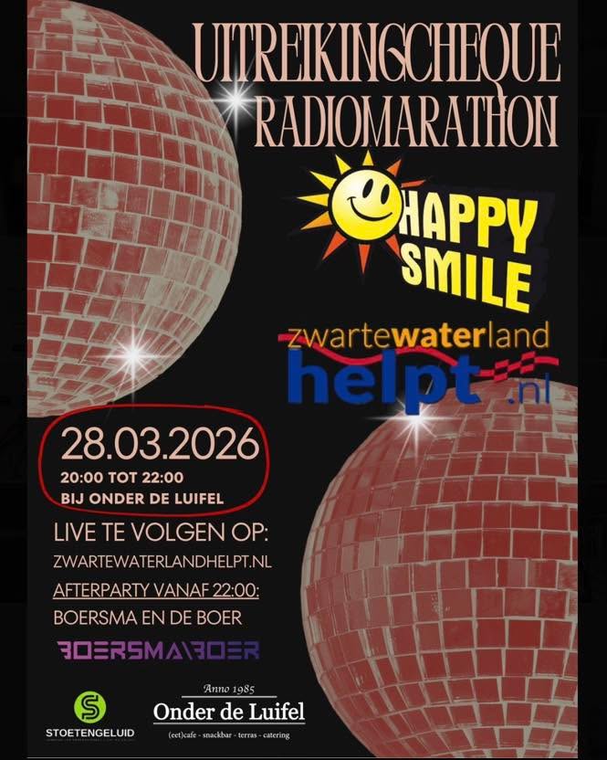 Luister 11, 12 en 13 december naar de radiomarathon. Zoals altijd kun je luisteren naar de radiomarathon op de radio via FM 107.3 (gemeente Zwartewaterland) of DAB+ (Regionaal). Kijk mee via de televisie op Ziggo kanaal 42, KPN/Telfort kanaal 1362, Odido kanaal 779, Vodafone kanaal 739 of Tele2 via het menu. Natuurlijk kun je ook altijd via onze website onze live stream zien.